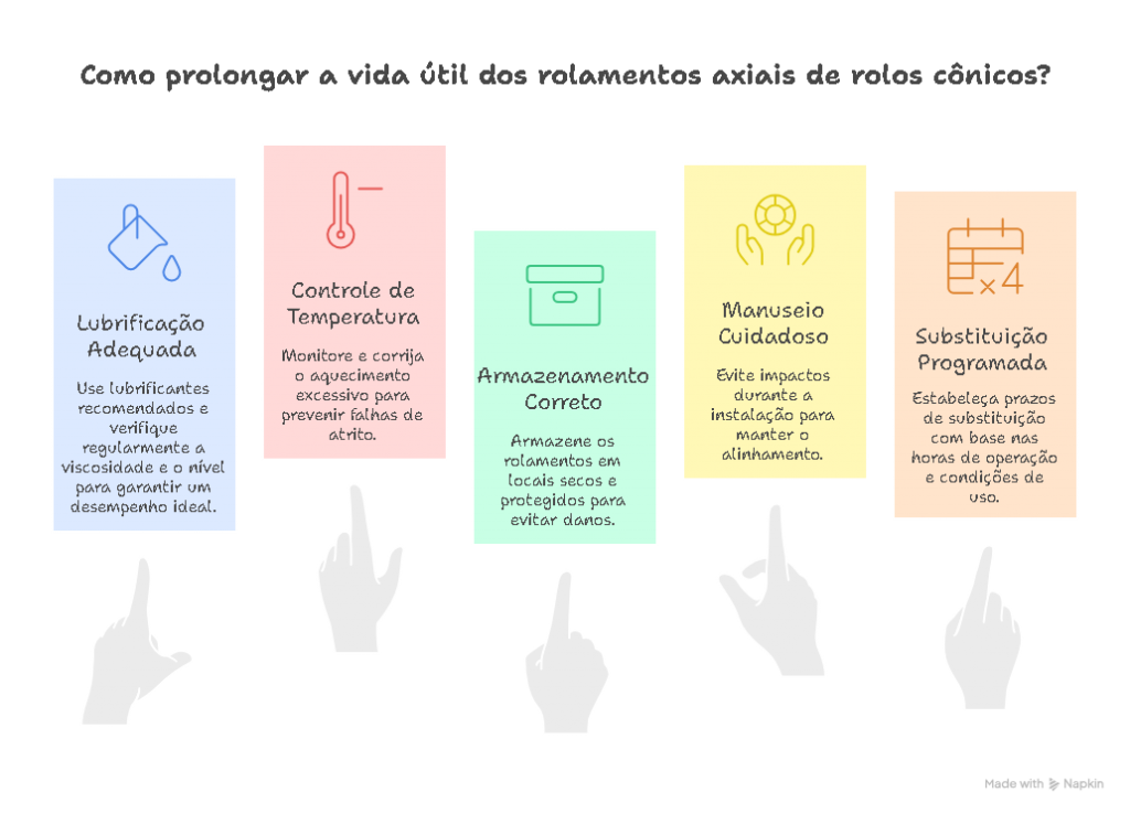 Para assegurar o desempenho e a longevidade dos rolamentos axiais de rolos cônicos, é essencial adotar práticas de manutenção consistentes. Entre as principais recomendações estão: